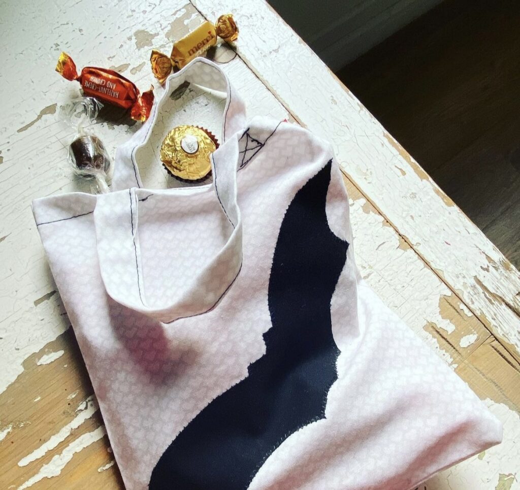 - Rajzolj denevér mintha filcanyagra, vágd ki, majd varrd fel a táska egyik oldalára. Helyezd fel ferdén és akkor olyan lesz, mintha repülne.