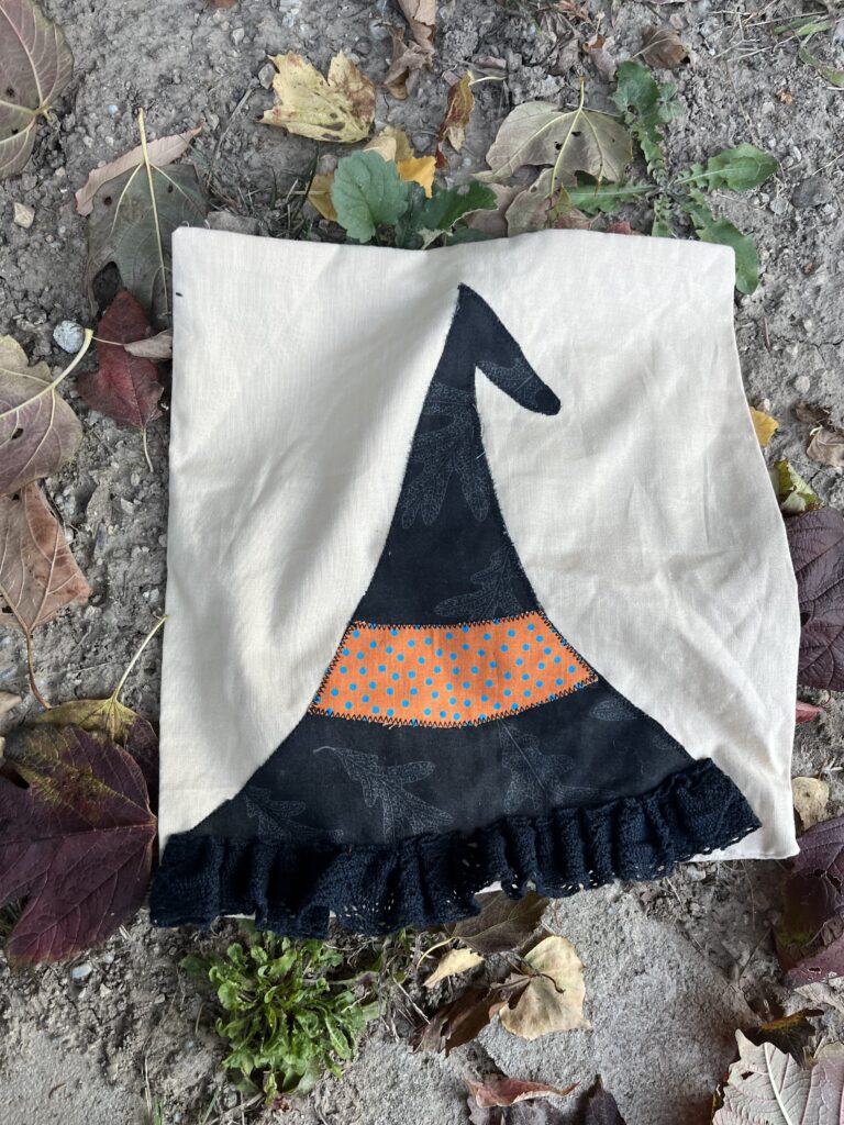 - szabd ki a kalapot úgy, hogy ne érjen le a párna aljára, legyen 3 cm alatta és varrd fel a párna elejére cikk-cakk varrással.
