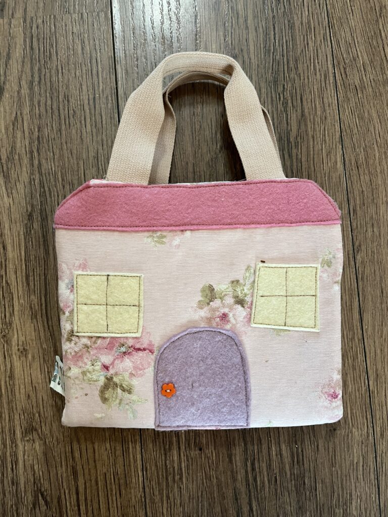 A babaház borítója a ház külseje. Ehhez egy rózsás mintájú pamutvásznat választottam, amely melegséget és kedvességet sugároz. A belső rész három rétegből áll: a külső pamutvászon, a középső vatelin, ami puhaságot ad, és a belső gyapjúfilc.