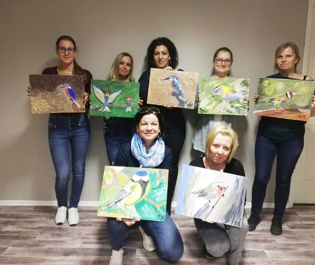 A festős csapatépítés esetén elleshetitek az ecsetkezelés technikáját, majd a rövid bemelegítő tanulás után közösen kitaláljuk, milyen motívum áll legközelebb a csapathoz. Már ez a részfeladat is rengeteg lehetőséget rejt az együttműködés fejlesztésére, az ötletelés folyamatának tökéletesítésére. Végül pedig megalkotjuk a közös művet.