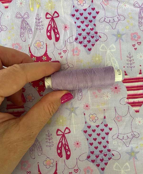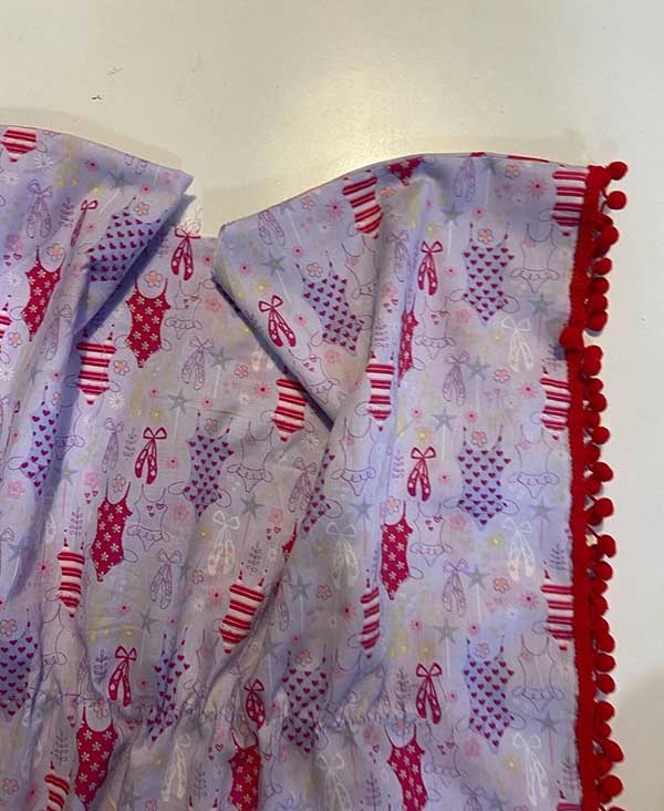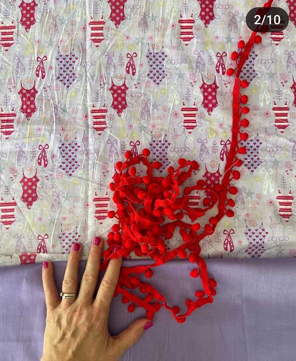 A díszítéshez lila cérnát és piros pompom szalagot választottam, a derékrésznél pedig vékony, lapos kalapgumit használtam, hogy szép formát adjon a ruhának.
