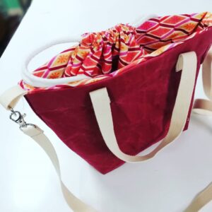 Ezt a táskát piros kraft papírból, belül puha mintás pamutvászonból varrtam, pamuthevederrel, pamutzsinórral és ezüst kiegészítőkkel.