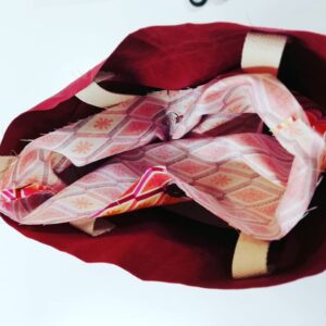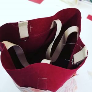 8. Összevarrjuk a táskát a béléssel. Kifordítjuk és belevarrjuk a szütyő pántját.