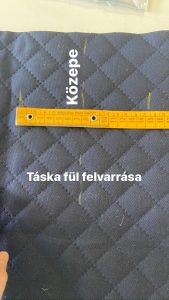 - A táska bélésének belső oldalára felillesztjük a zsebet: a táska és a zseb közepét egymáshoz igazítjuk, a zseb teteje 7 cm-re legyen a bélés tetejétől.